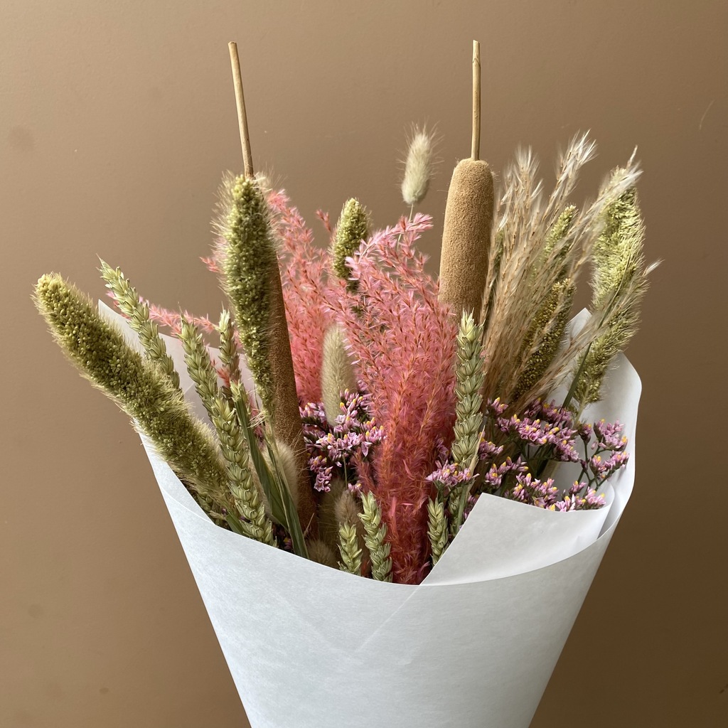 Tørket bukett bestående av naturlige materialer i brune og naturlige toner med innslag av rosa.