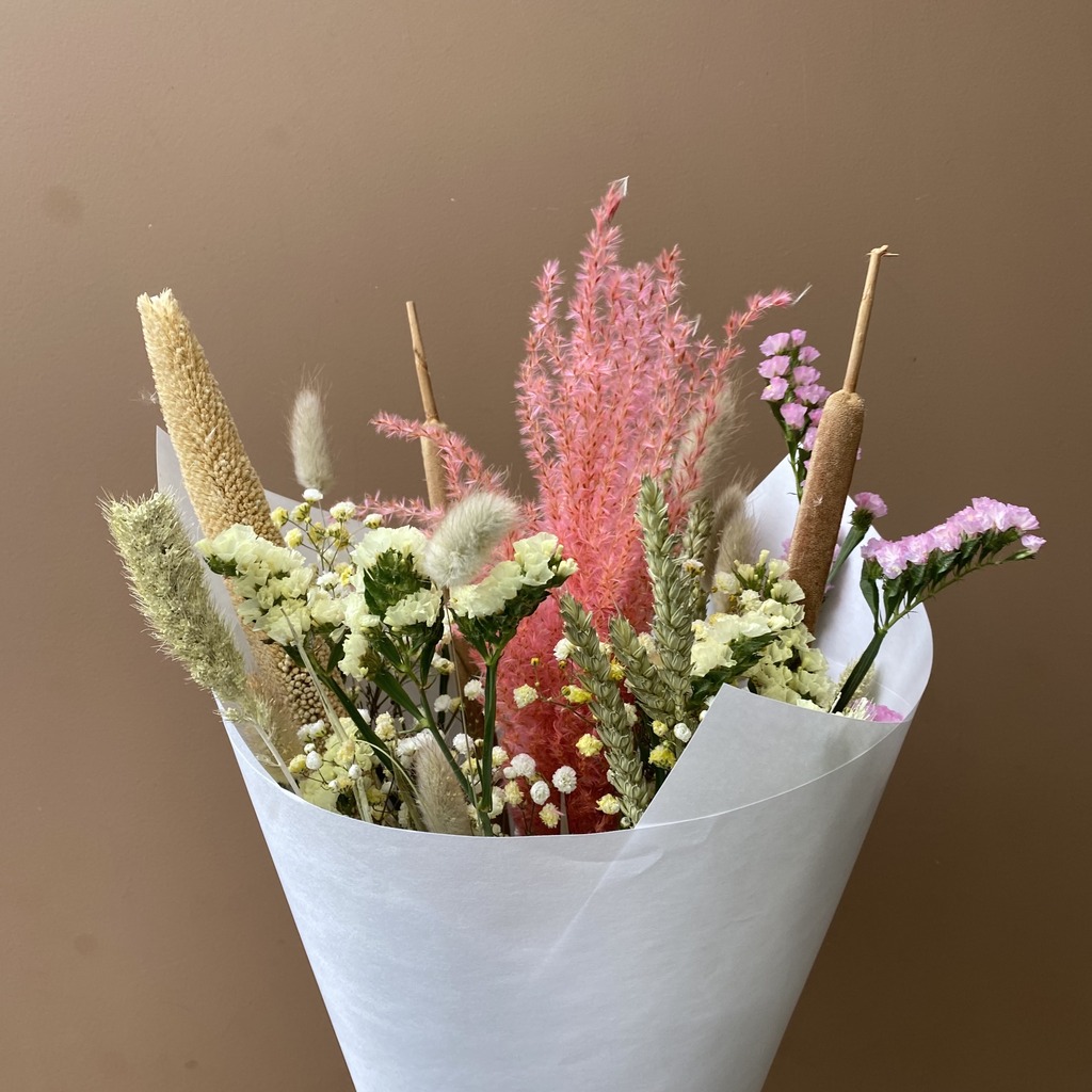 Evighetsbukett med tørkede, naturlige materialer i naturfarger, gult og rosa.