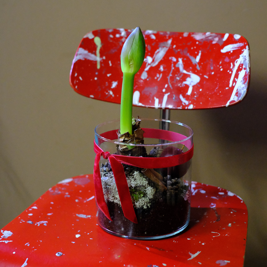vVåre kraftige kvalitetsløk plantet og dekorert i glass. Velg mellom hvit og rød Amaryllis.