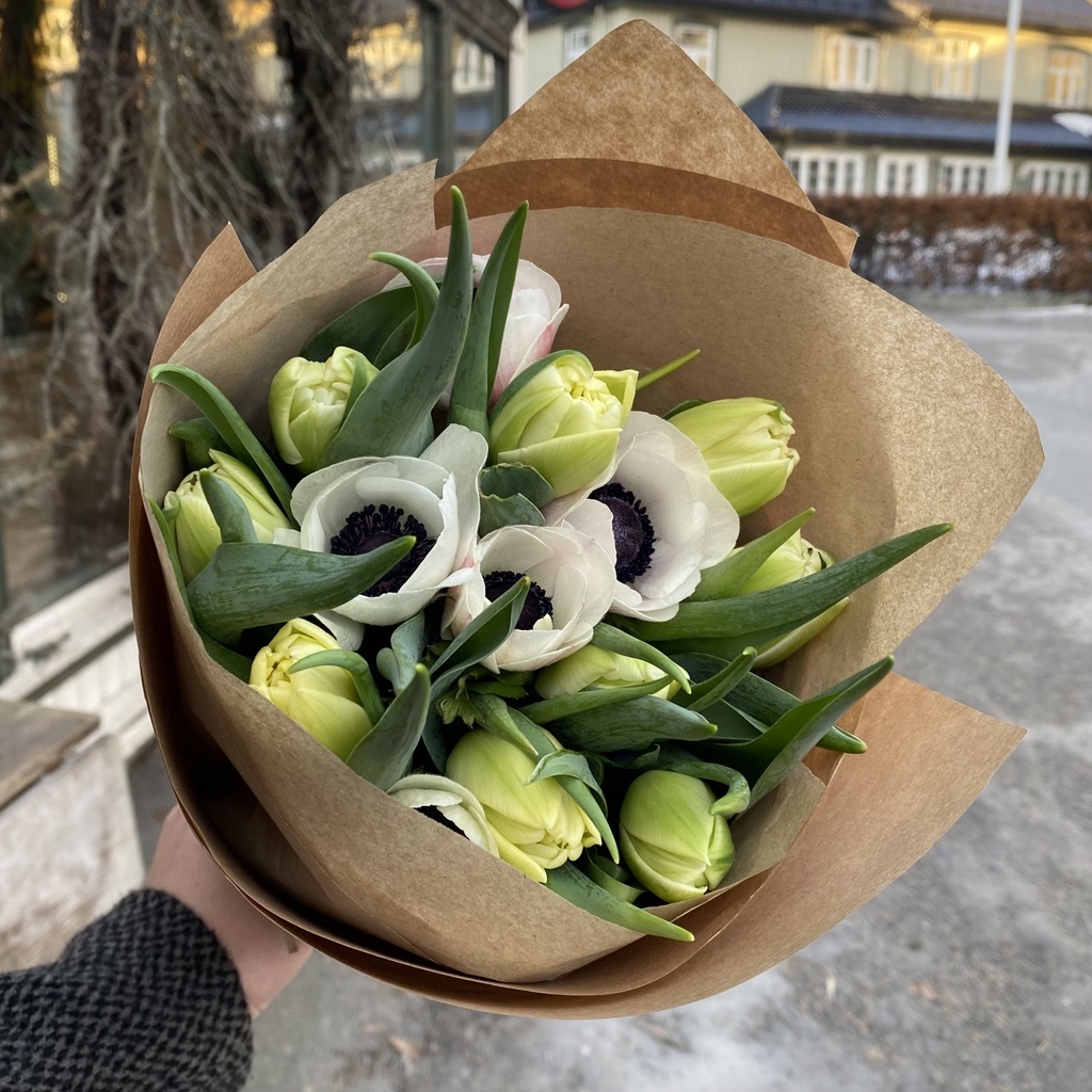 De vakreste hvite anemoner, satt sammen med flotte doble kremhvite tulipaner og ranunkler. Vakker i sin enkelhet.