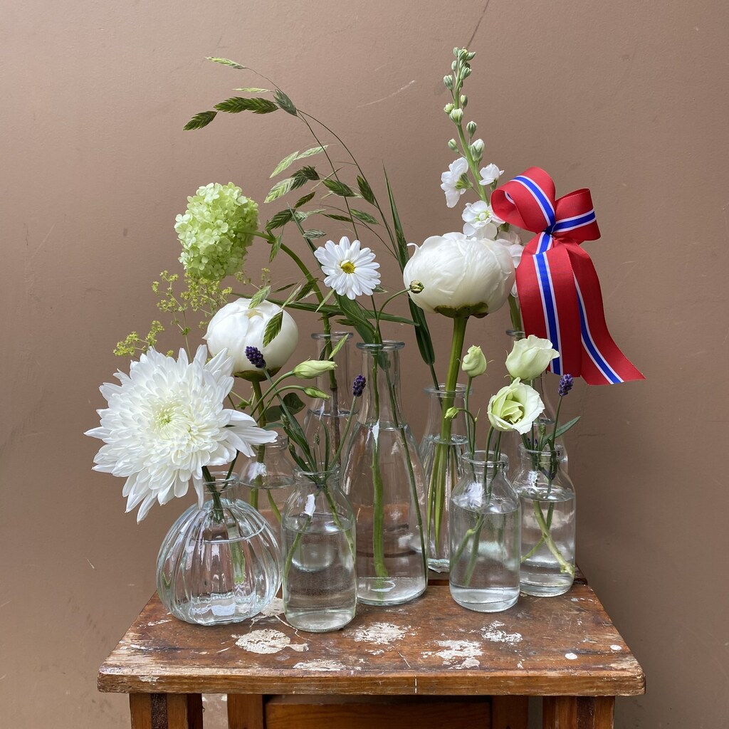 Skap et levende og vårlig 17. mai-bord med vårt partykit! Denne pakken inneholder et assortert utvalg glassvaser med snittblomster ferdig arrangert i vann. Vasene er dine til odel og eie - ved neste anledning betaler du kun for stilkene!
