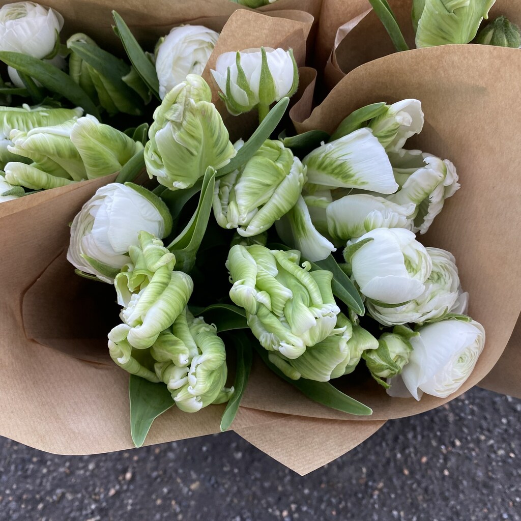 SISTE FRIST FOR BESTILLING MED LEVERING FØR JUL ER KL. 11.00 23. DESEMBER! OBS! Butikken er stengt 24. desember. Vakker og ren bukett med hvite papegøyetulipaner og hvite ranunkler.