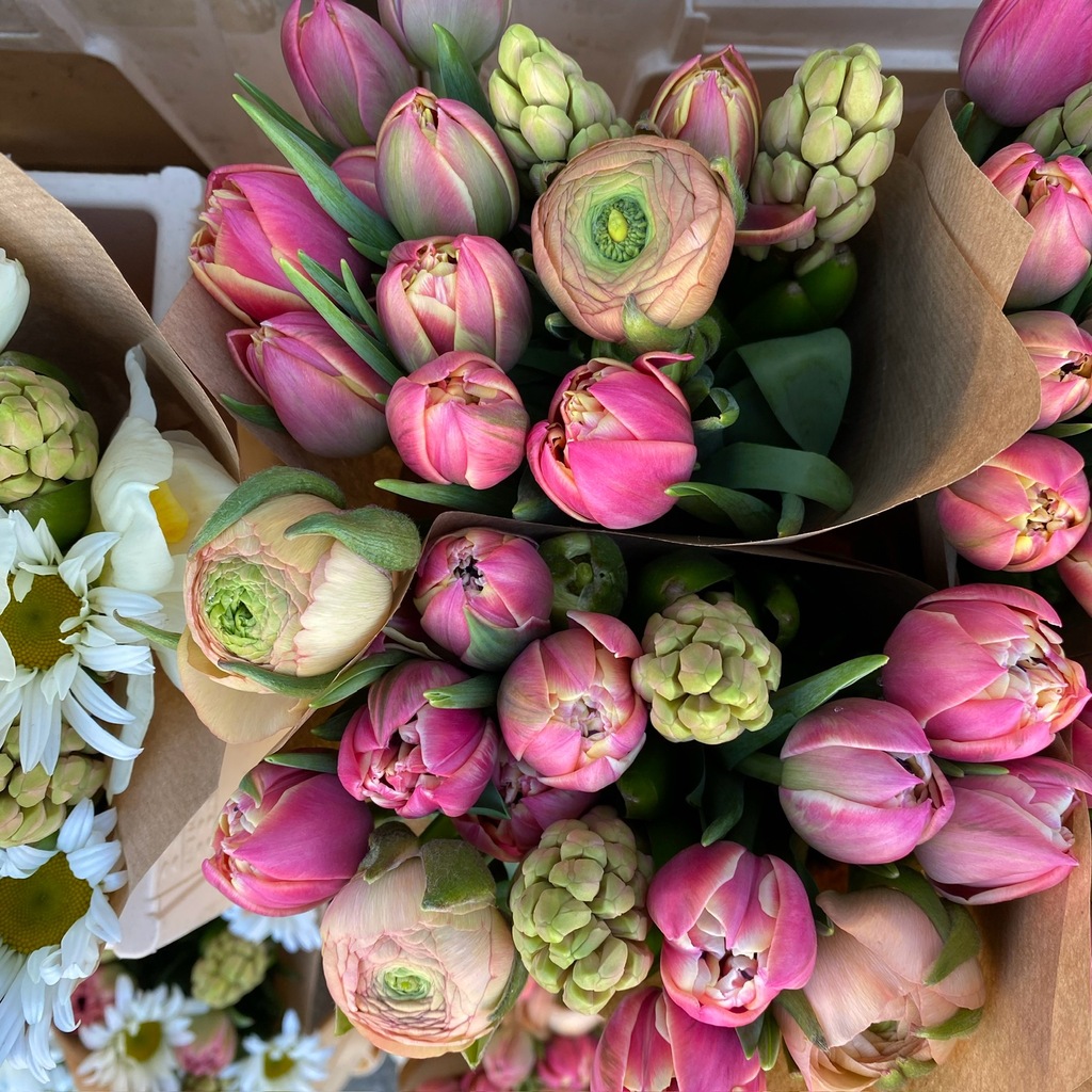 En deilig variant av våre populære buketter bestående av vårfavorittene hyacinter, ranunkler og doble tulipaner. Hyacintene blir lys rosa, og tulipanene og ranunklene blir fantastiske når de springer ut.