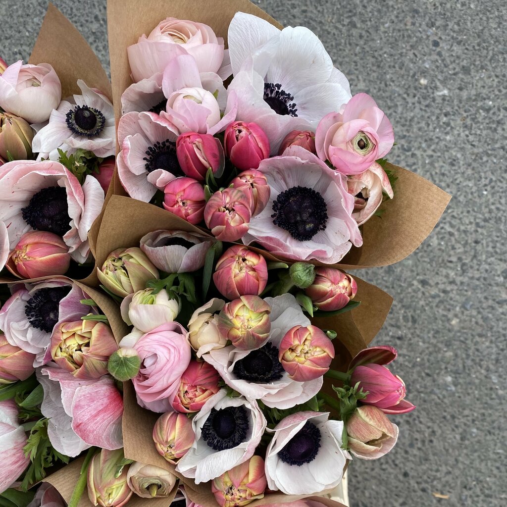Doble tulipaner med søte rosa ranunkler og sarte florlette anemoner.