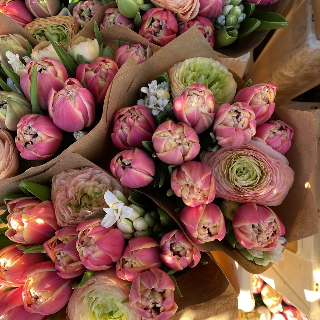 Deilig frisk bukett med doble tulipaner, ranunkler og hyacinter.