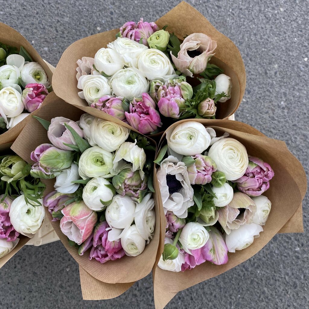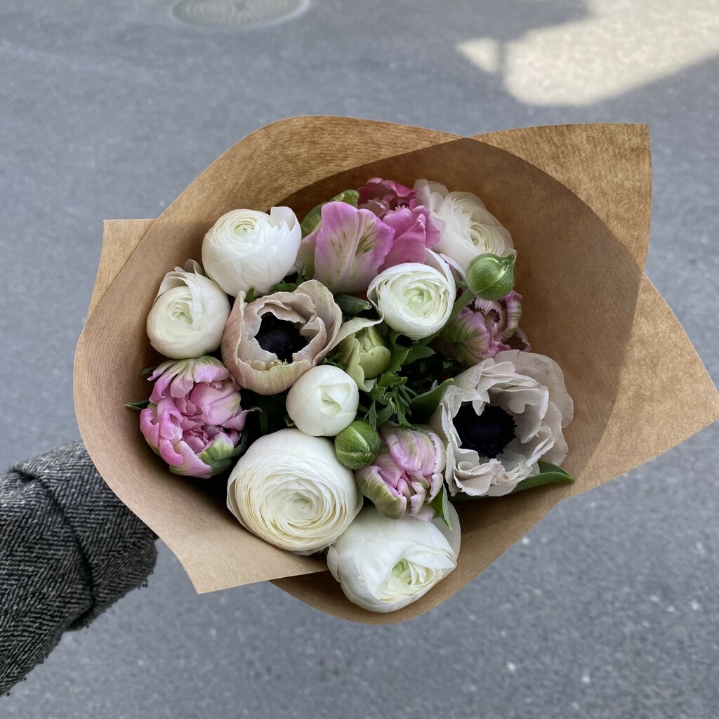 Kritthvite ranunkler kombinert med sarte anemoner og papegøyetulipaner.