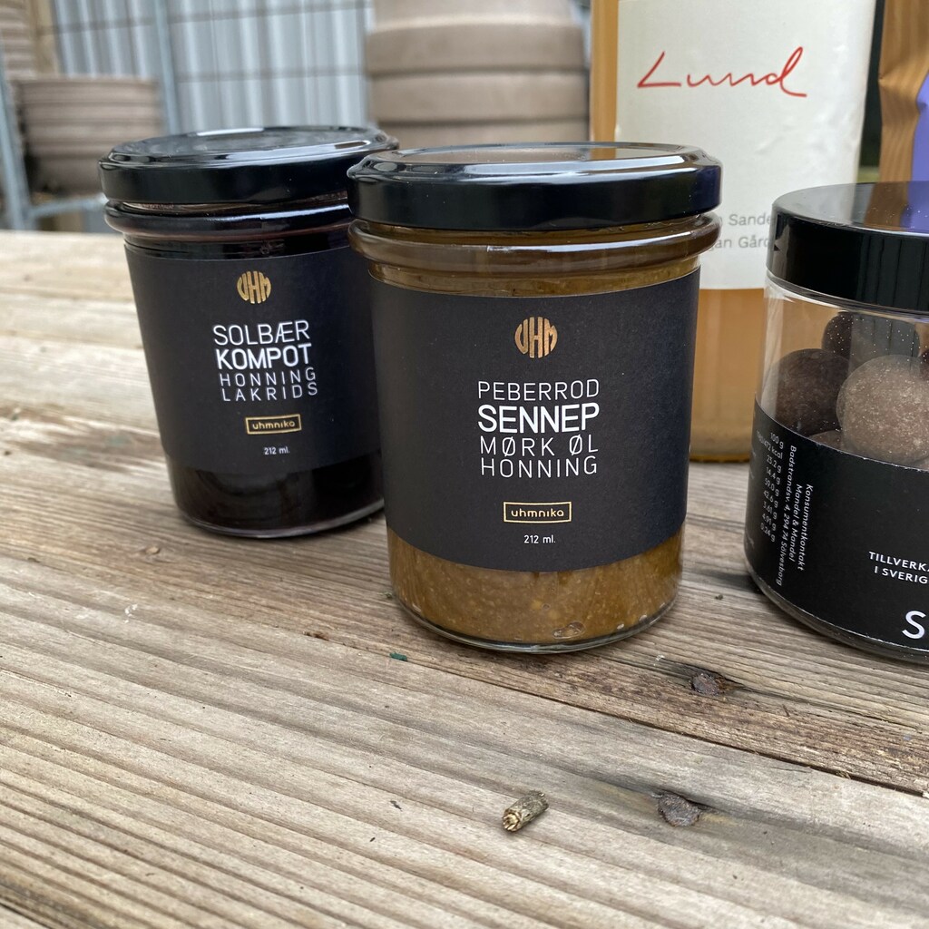Vi tilbyr de lekreste matprodukter, som vi selv bruker og elsker. Disse kan vi varmt anbefale til en pappa som fortjener litt snadder! Gourmetgaven inneholder en pose chips, et kremmerhus med nydelig økologisk sjokolade, fantastisk god sennep (evt marmelade eller kompott dersom lageret tar slutt), og en flaske Lund eplemost, produsert på Nordre Bergan gård i Sandefjord. I den store gourmetgaven har vi lagt til enda et glass med noe godt (kompott/marmelade/pesto), og byttet ut kremmerhuset med en boks med lakris.