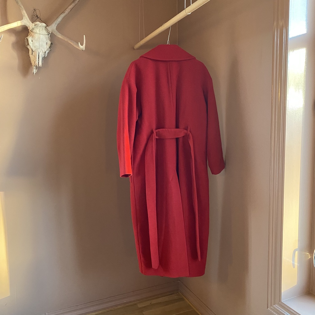 Rød kåpe fra American Vintage, laget av 50% akryl, 25% polyester, 20% ull, og 5% andre fiber. Størrelse small. Ta kontakt hvis du finner noe du ønsker å kjøpe. Med forbehold om at ting kan bli solgt i butikken uten at vi rekker å oppdatere her. Du kan enkelt nå oss på telefon: 48388670, e-post: rubyeliseshop@gmail.com, eller på Instagram!